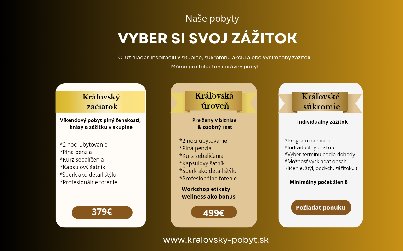Vstúp do sveta, kde sa spája krása, elegancia a zážitok. Kráľovský pobyt je vytvorený pre ženy, ktoré túžia po jedinečnom čase pre seba – obklopené módou, vizážou, šperkami, odbornou starostlivosťou a inšpiratívnou spoločnosťou.